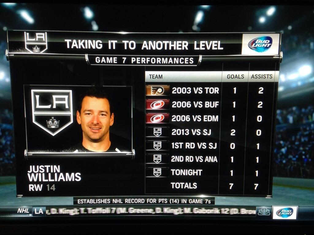 1. Justin Williams is clutch. Just look at his production in playoff Game 7s. He is the best Game 7 playoff scorer, ever! Yes, even better than Gretzky and Glenn Anderson. If this was Final Fantasy 7, Williams would be doing 7,777 damage each hit!